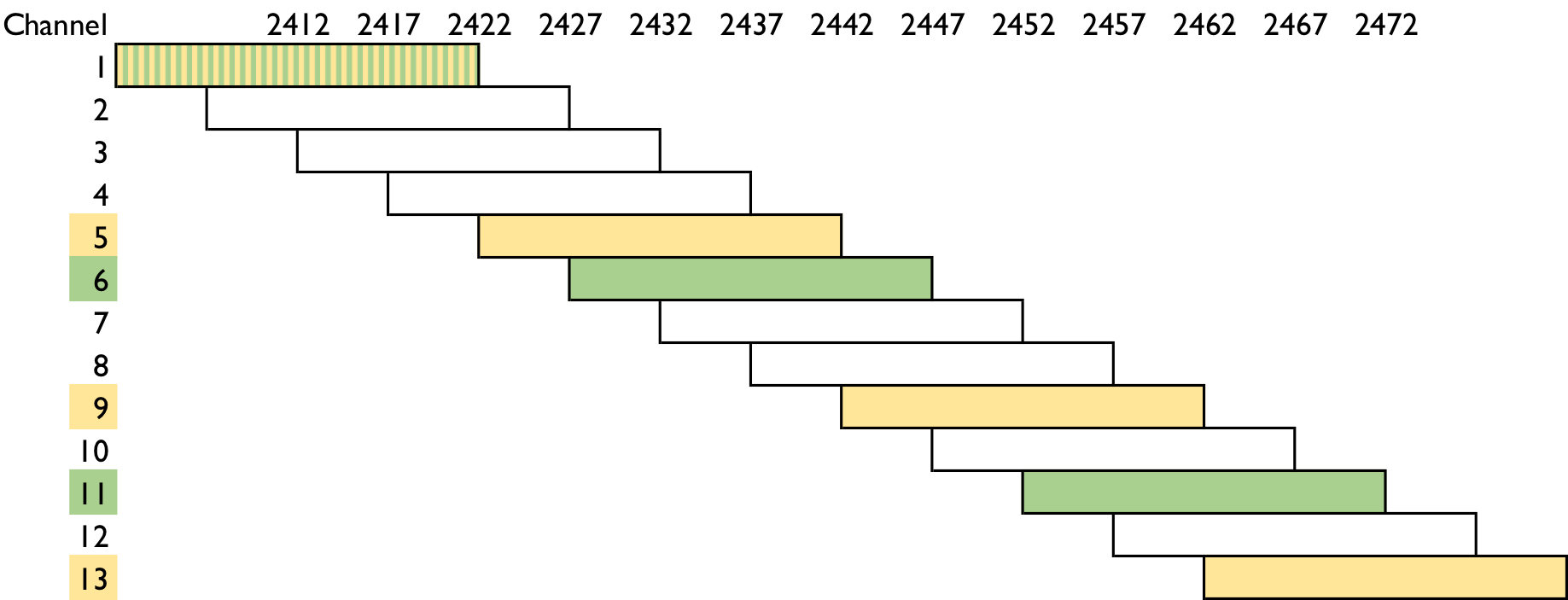 In theory the yellow bars 1, 5, 9 and 13 would form four distinct channels with no overlap. Unfortunately most WiFi radios assume wider 22MHz channels so they receive a signals from the adjacent channels as well. If the radio detects a transmission it will wait for the channel to vacate. This can make adjacent radios (on channels 1 and 5 for example) take turns, which halves the throughput.