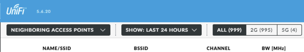 A UniFi controller reports on the neighbouring APs it detects. In this case 995 access points (not users!) were detected on 2.4GHz in the last 24 hours while on 5GHz there has been four.