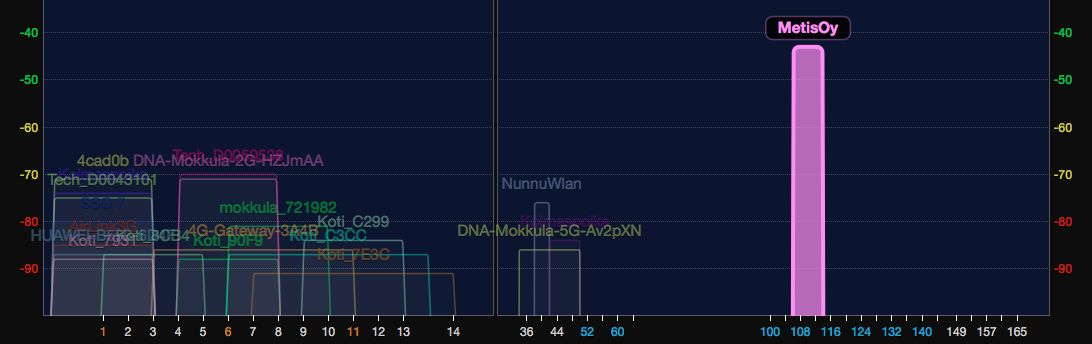 WiFi Explorer shows the signal strength as columns. The width of the column is the channel width. On the left there are 2.4GHz channels 1–14 and on the right the 5GHz channels 36–165. Quite a bit less crowded on 5GHz!